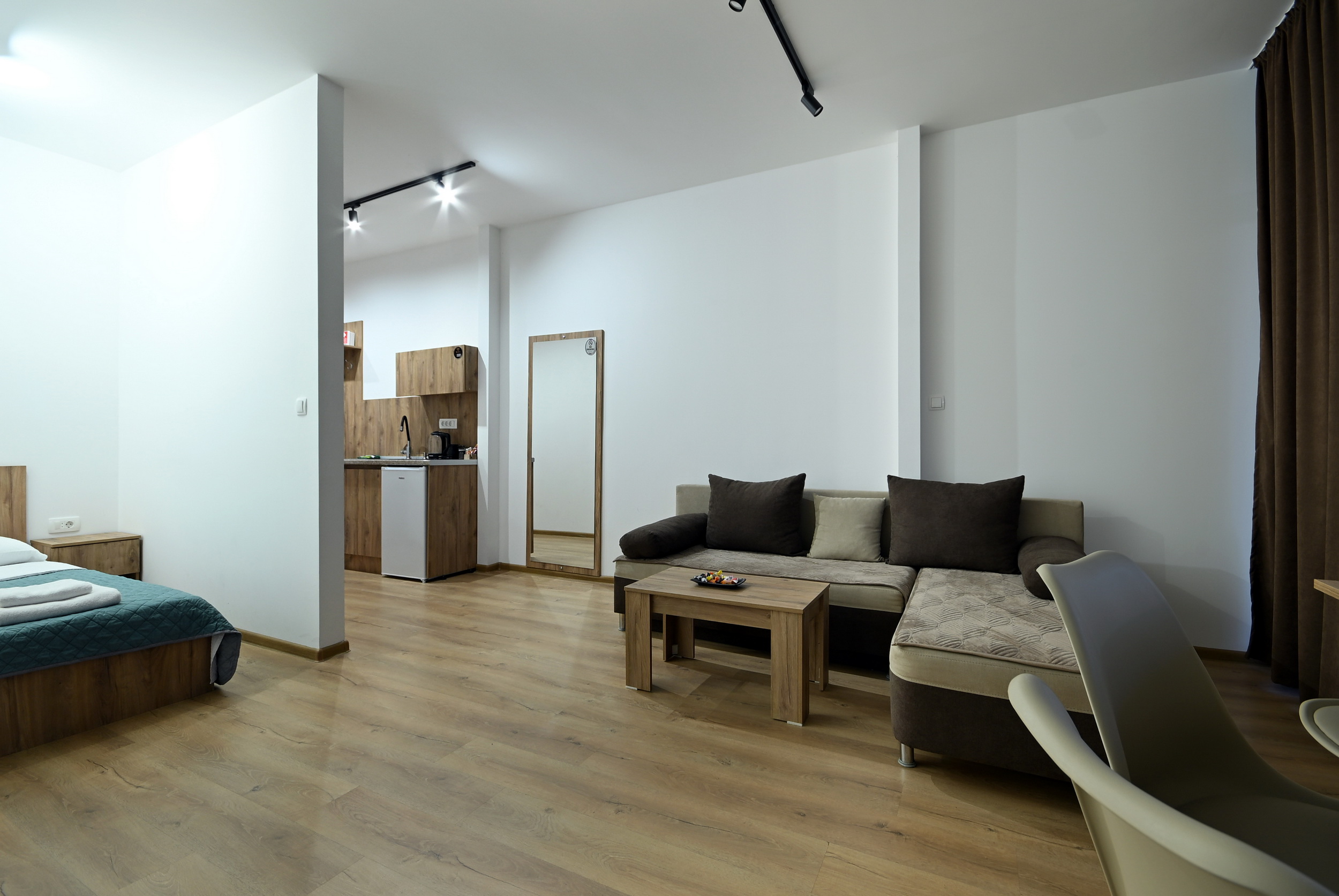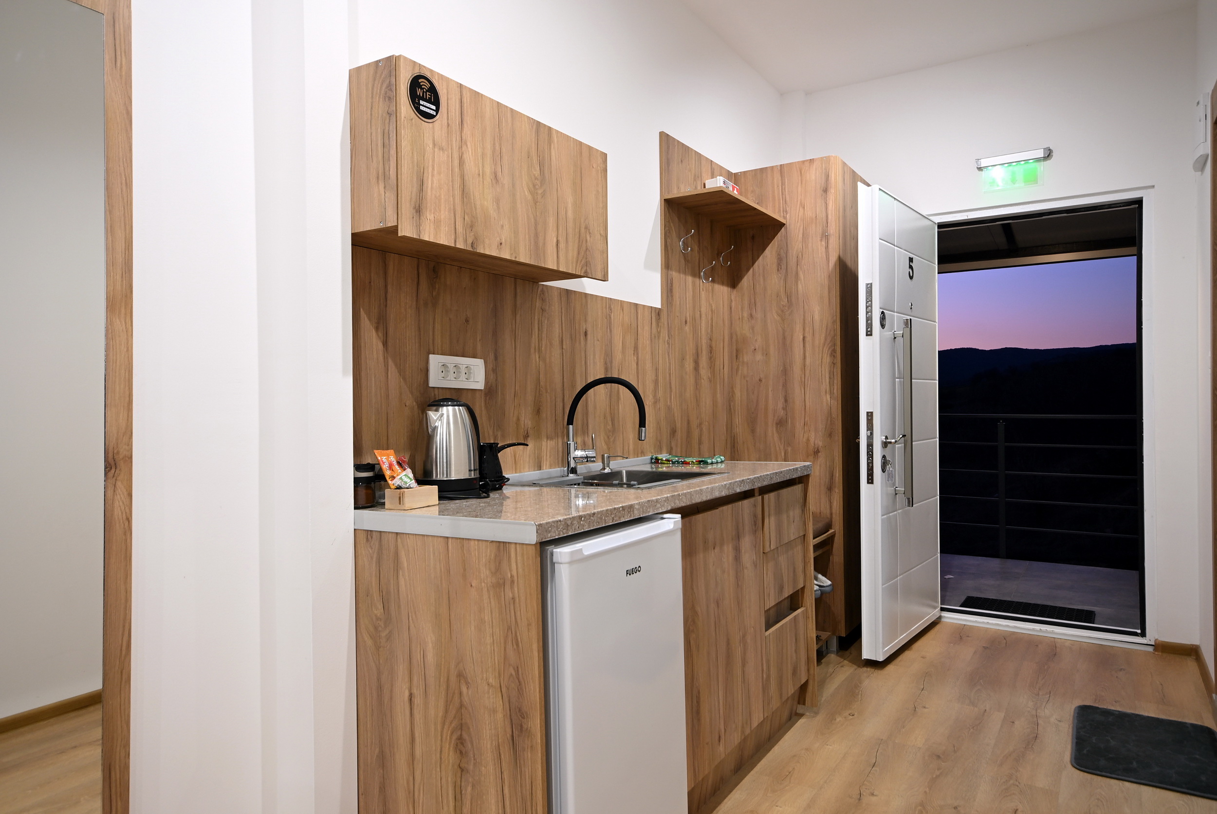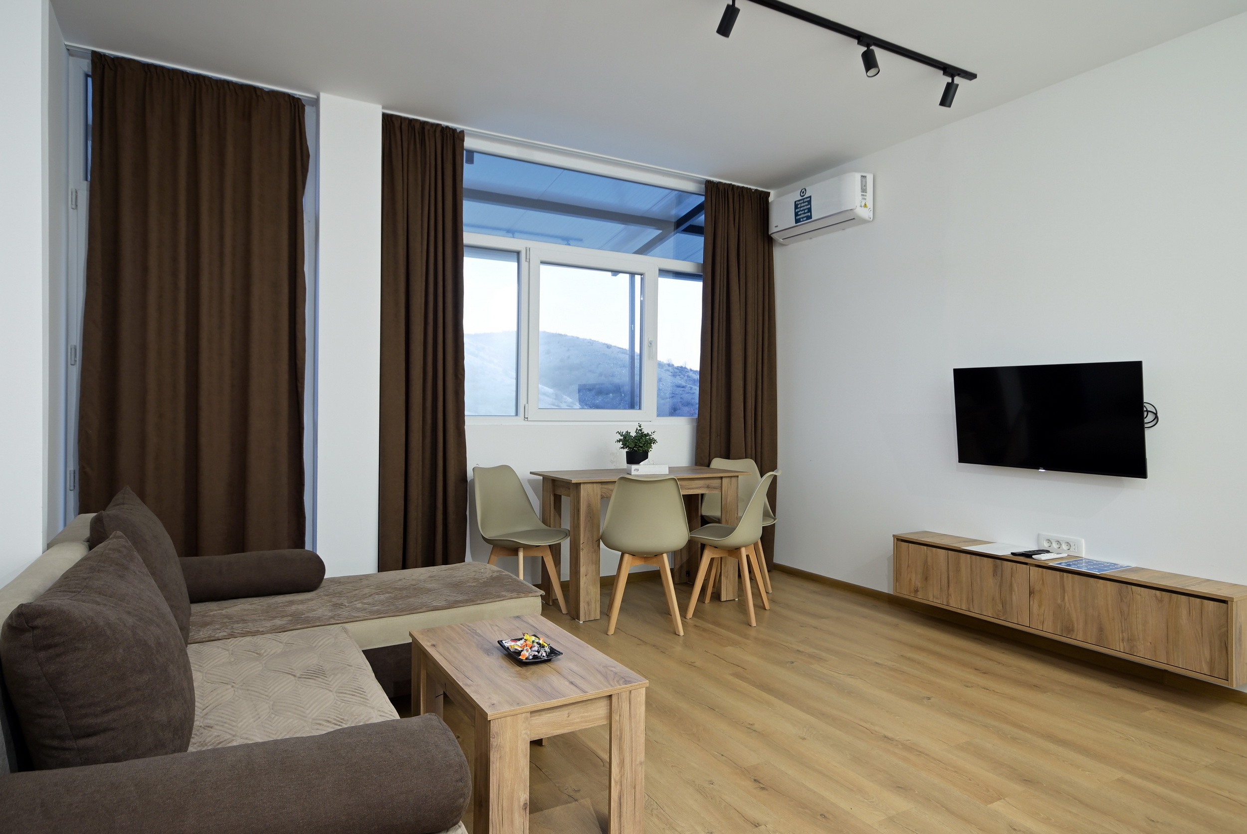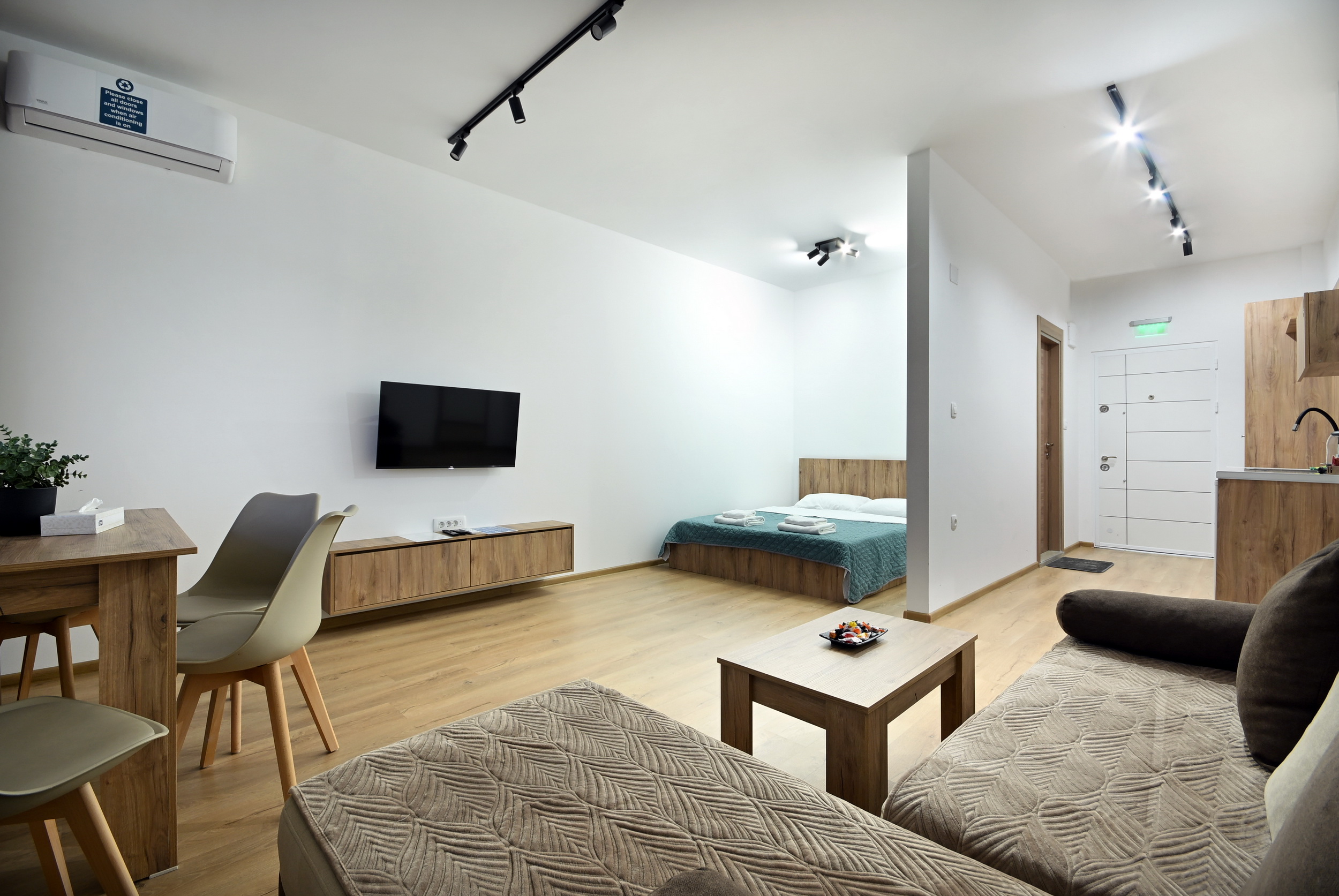 This modern apartment features a comfortable living room and a separate bedroom, accommodating up to 4 guests. It includes one king-size bed in the bedroom and a sofa bed in the living room. Enjoy a private terrace with breathtaking lake and mountain views — the perfect spot for morning coffee or relaxing at sunset. The apartment is fully equipped with a private bathroom, kitchenette, air conditioning, free Wi-Fi, and a flat-screen LED TV. Bed linen and towels are provided for your convenience. Ideal for guests looking for comfort, nature, and an unforgettable stay.
