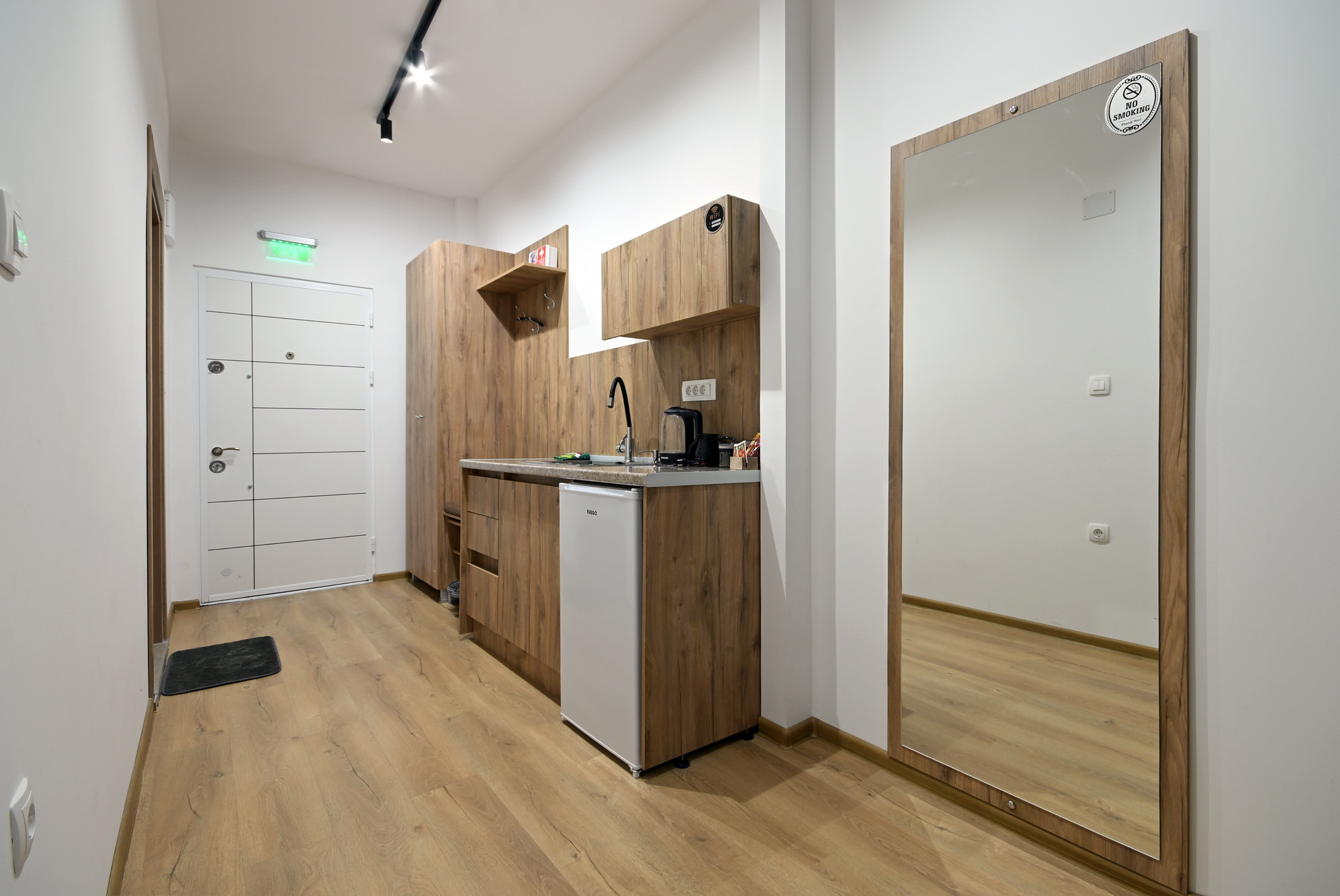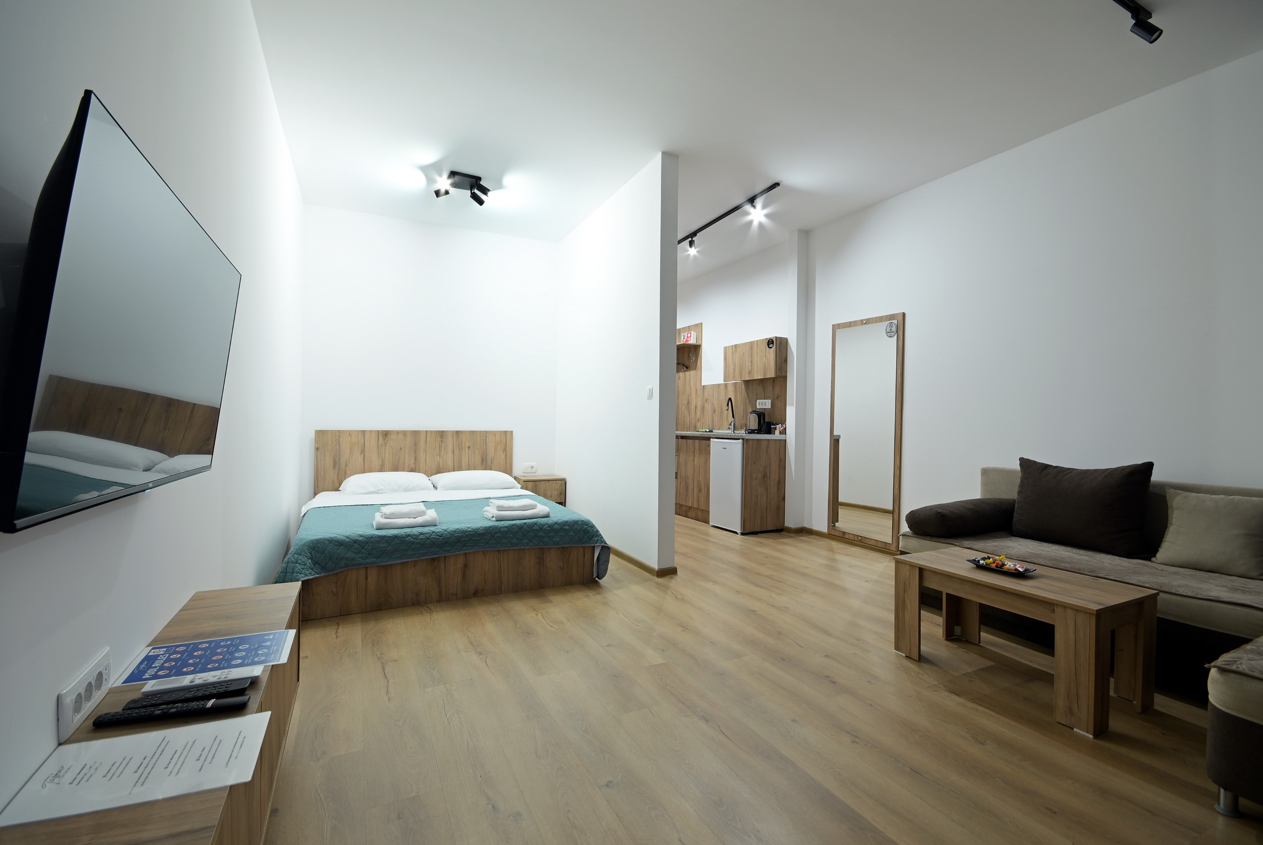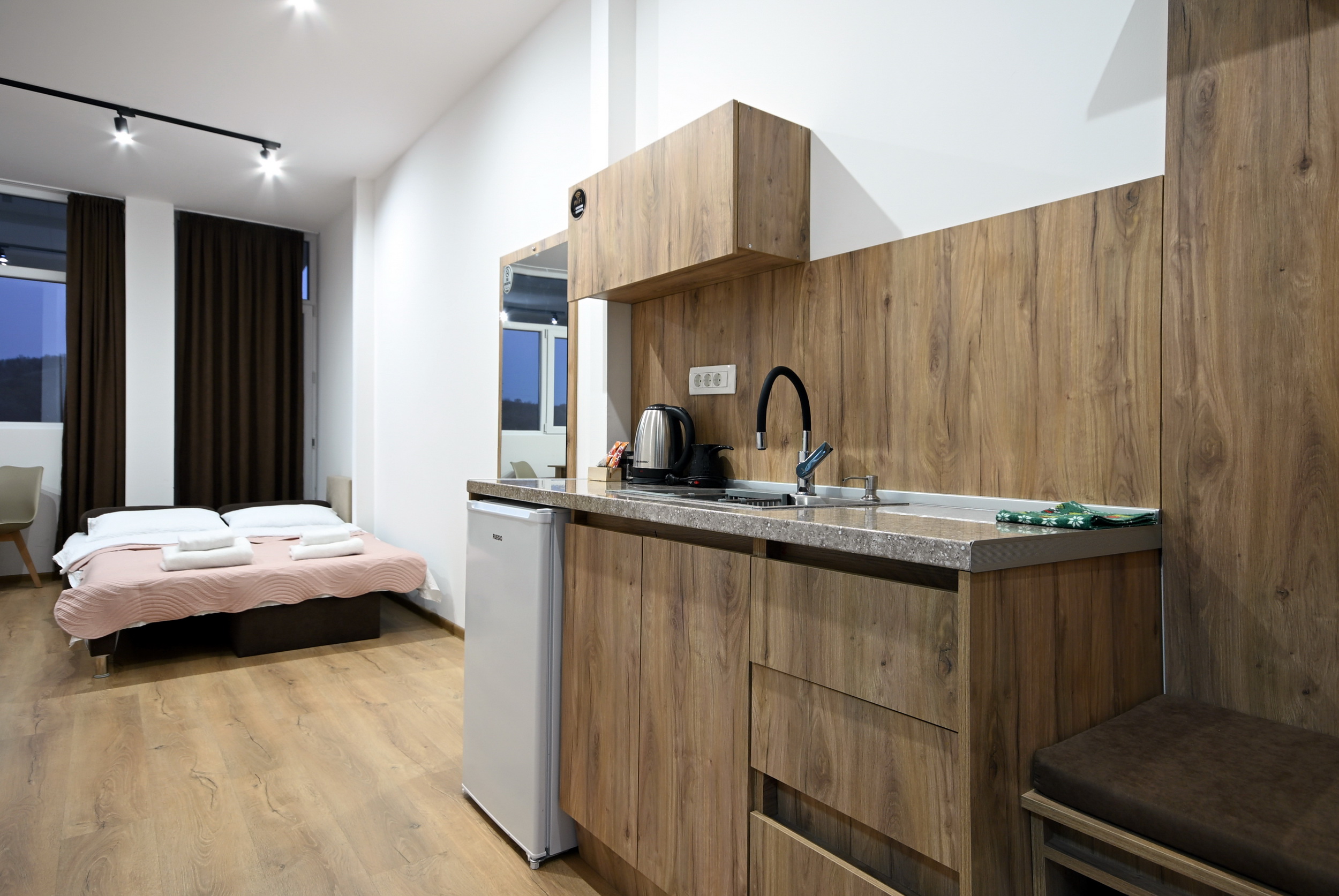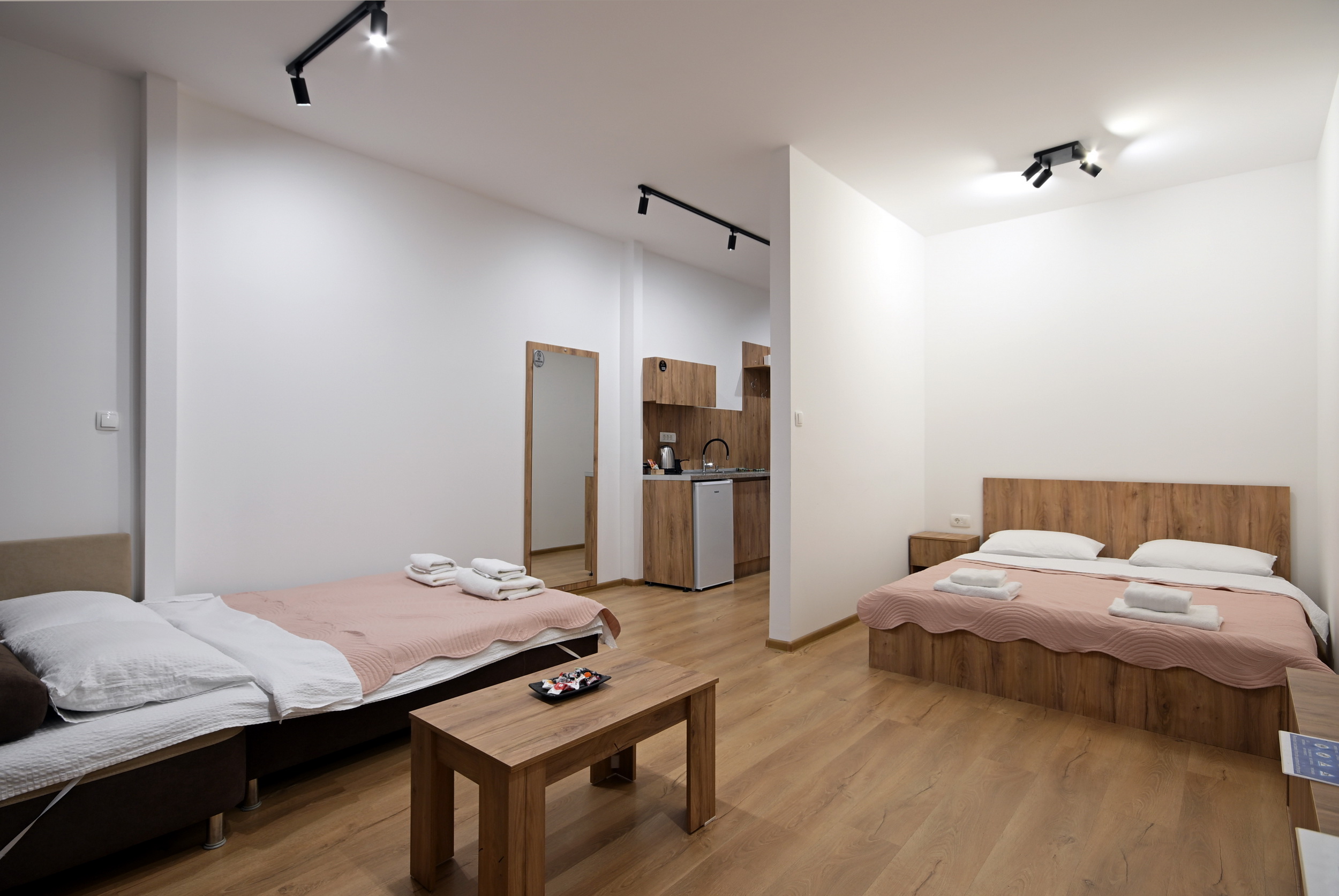 This comfortable Family Studio accommodates up to 4 guests and features one double bed and one sofa bed, making it ideal for couples, families, or small groups. Guests can enjoy a private terrace with breathtaking lake and mountain views — the perfect place to relax with a morning coffee or unwind while watching the sunset. The studio includes a private bathroom, a fully equipped kitchenette, air conditioning, free Wi-Fi, and a flat-screen LED TV. Fresh bed linen and towels are provided for your comfort. Perfect for guests seeking relaxation, nature, and unforgettable views.