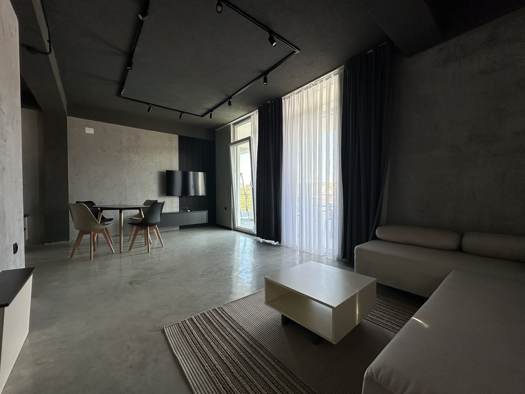 This is a modern apartment with a living room with a sofa for two and a separate bedroom for two. A full kitchen, a spacious terrace and a bathroom.