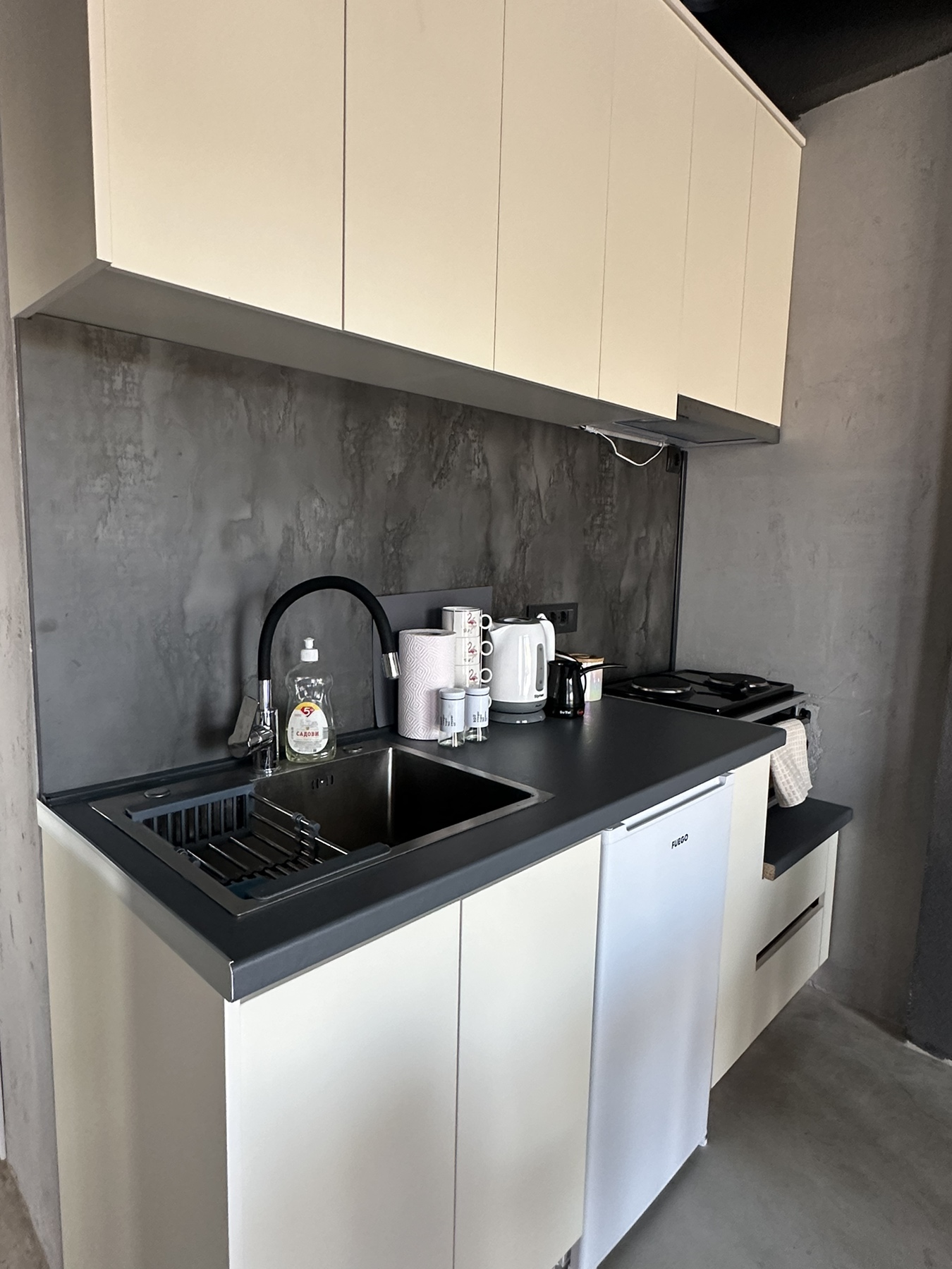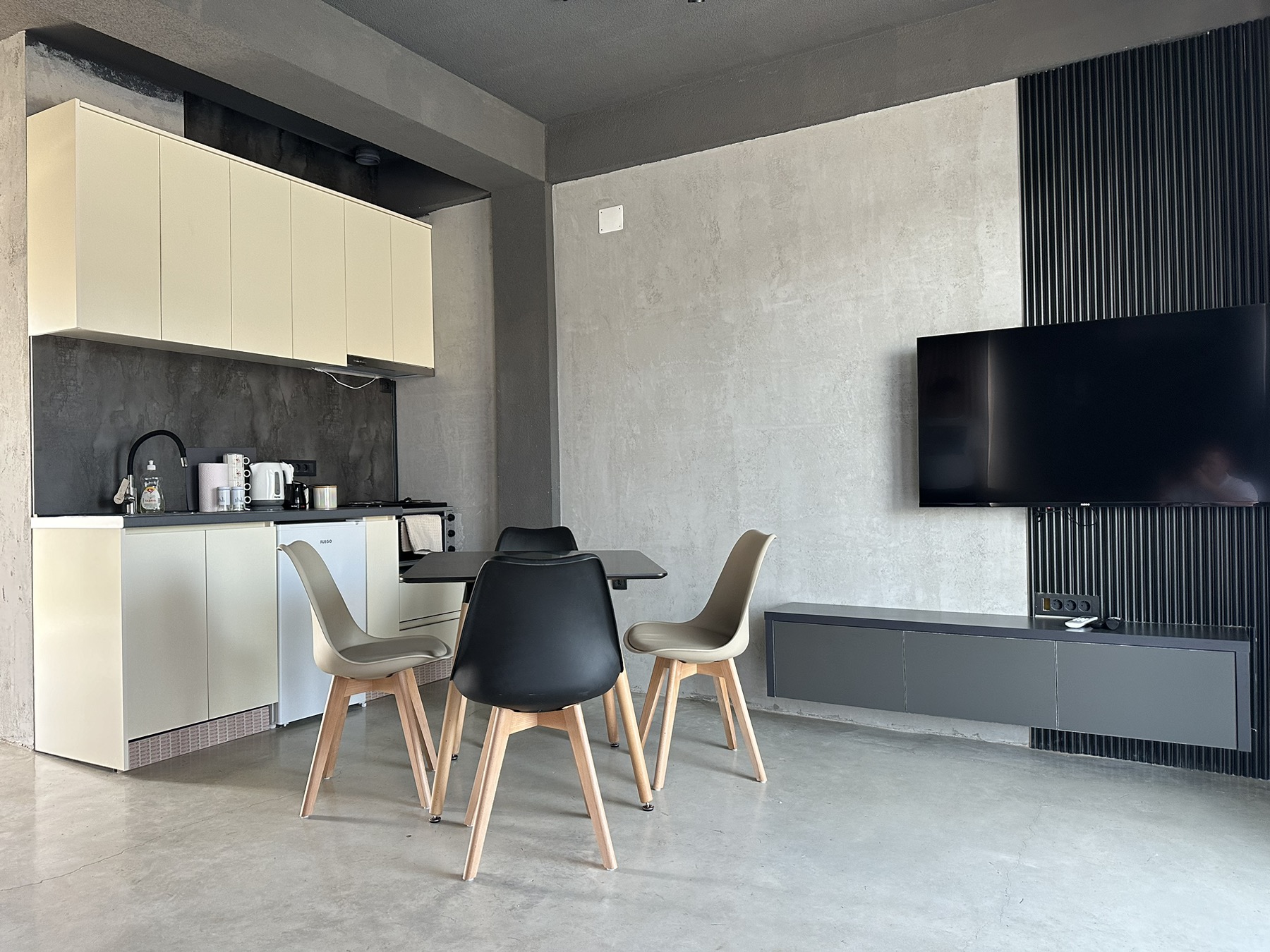 Family Studio for up to 4 guests,featuring one double bed and one sofa bed.Private terrace with breathtaking lake and mountain views-the perfect spot for morning coffee or sunset relaxation.Includes private bathroom,kitchenetteair conditioner,free WiFi,flat screen TV.Bad linen and towels provided.Ideal for guests looking for comfort,nature and unforgettable views.