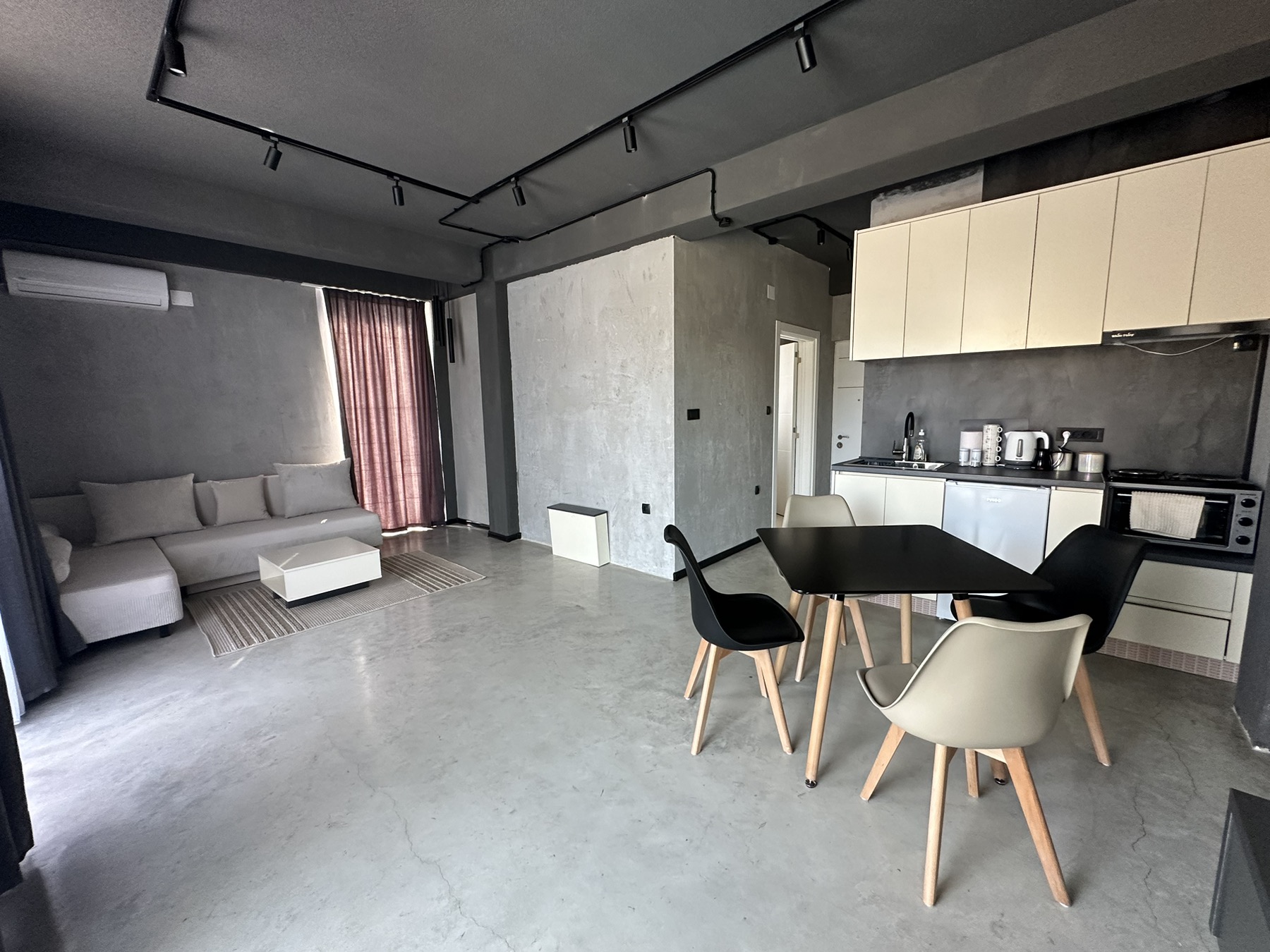 This is a modern apartment with a living room with a sofa for two and a separate bedroom for two. A full kitchen, a spacious terrace and a bathroom.